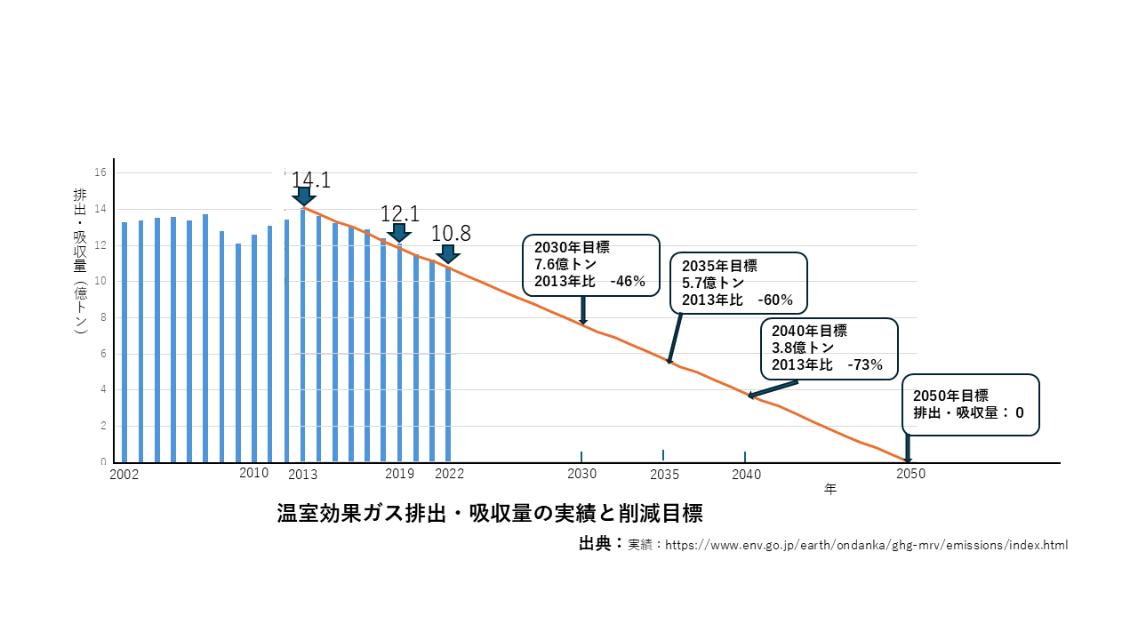 日本のNDCでは、2013年を基準として、2050年までにネットゼロにする目標となっています。2002年から2022年までの日本の排出・吸収量の実績(棒グラフ)と、2050年までにネットゼロを達成するため目標値(実線)を図に示します。